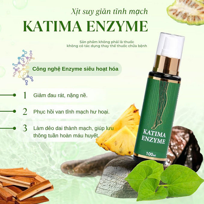 Katima Enzyme là sản phẩm xịt giãn tĩnh mạch được bào chế từ enzyme tự nhiên và thảo dược quý hiếm. Sản phẩm giúp giảm căng tức, đau nhức chân, đồng thời hỗ trợ làm tan huyết ứ, giúp máu lưu thông tốt hơn.