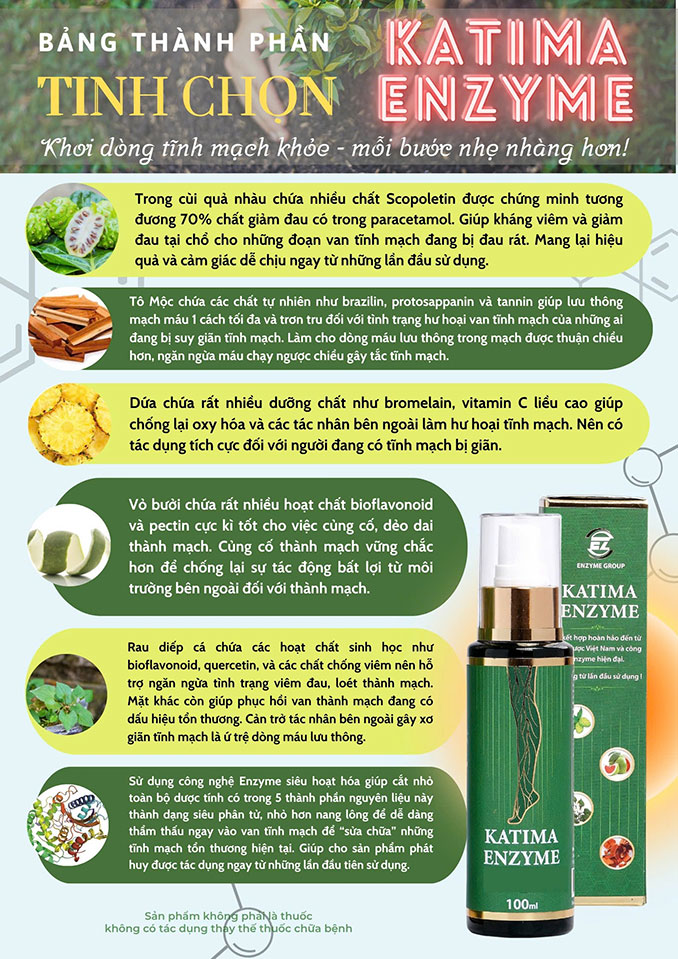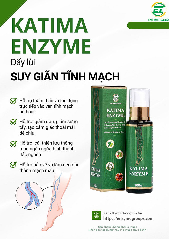 Xịt giãn tĩnh mạch Katima Enzyme là lựa chọn hoàn hảo cho những ai đang tìm kiếm giải pháp tự nhiên, an toàn và hiệu quả để cải thiện tình trạng giãn tĩnh mạch.